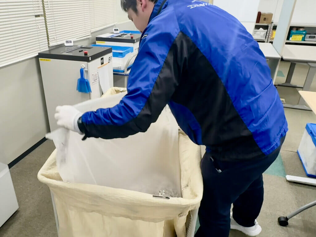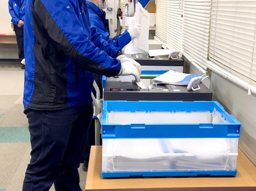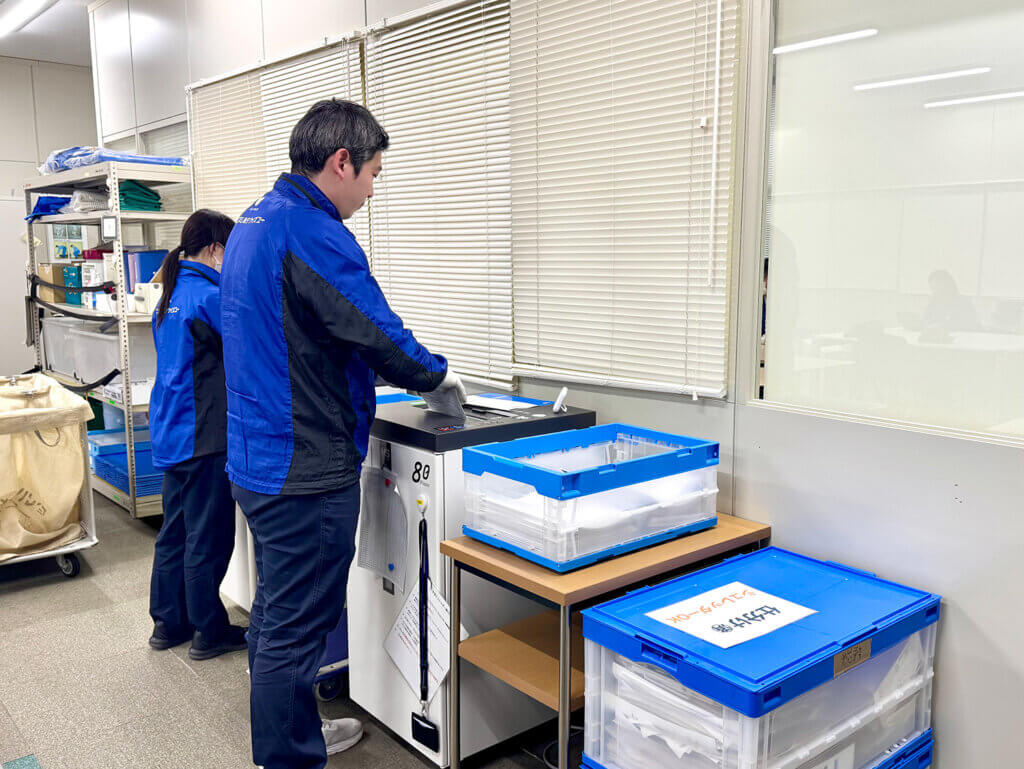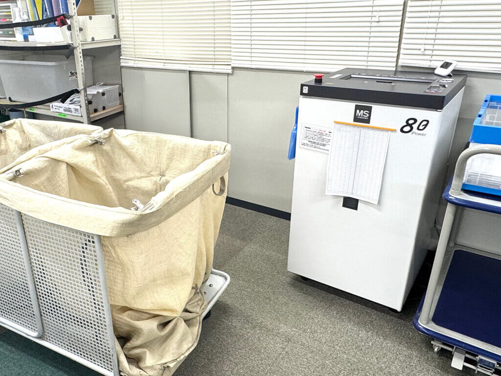 「従来使用していた機種は挿入部にコンベアがある機種であったため、新たに導入する機種は大量処理する際の作業性と、細断時の音が特に心配でした。この点については、明光商会さんのショールームで実際に複数の製品に触れ、体験させていただき、F80Pであれば大丈夫という確信が持てました」