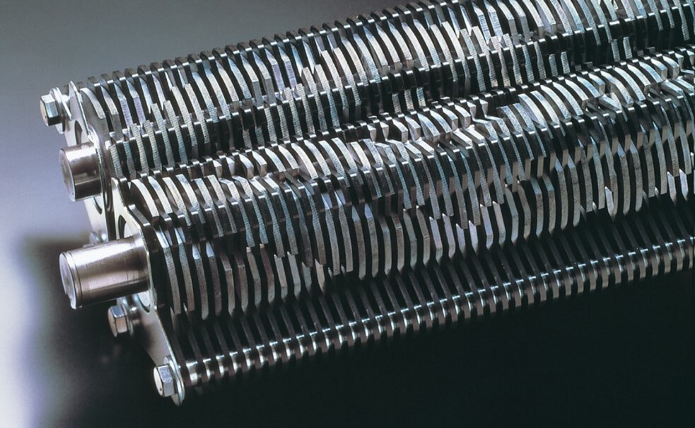 水車のように回転する2枚のプレートが細断くずの片寄りをなくし、均等にならします。これにより、くずの山を手でならす必要がなく、くず袋を交換する際のくずこぼれを軽減することができます。