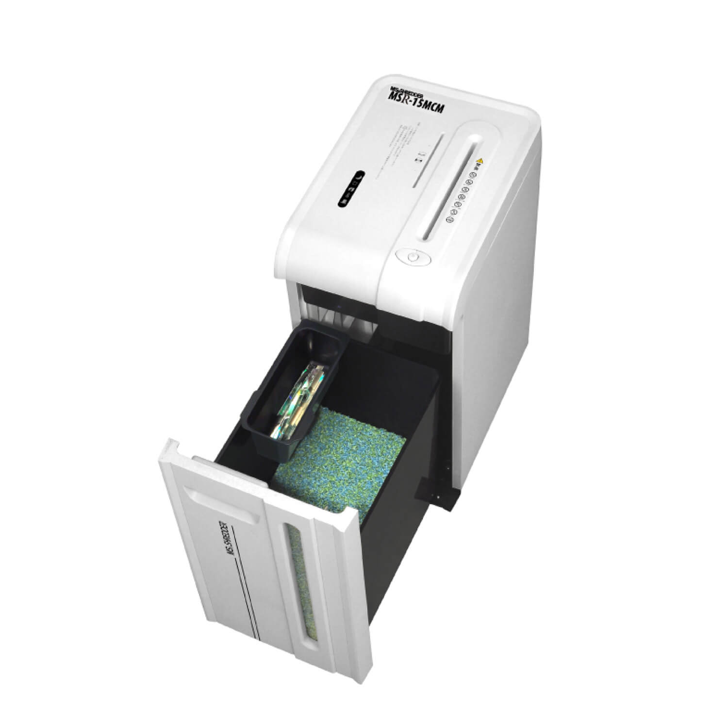 データメディア投入口から投入し、細断したデータメディアはくず箱内の専用トレイに分別収容でき、紙と混ざることはありません。