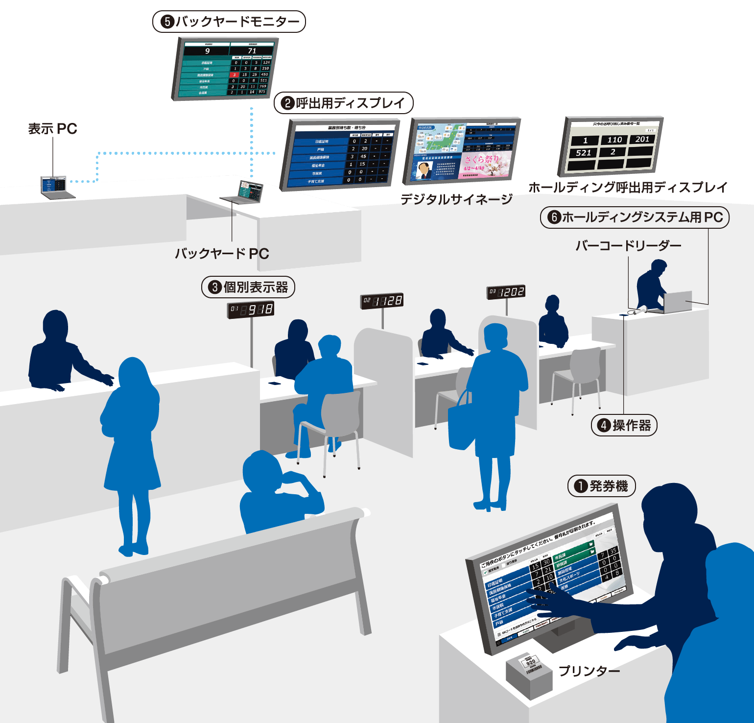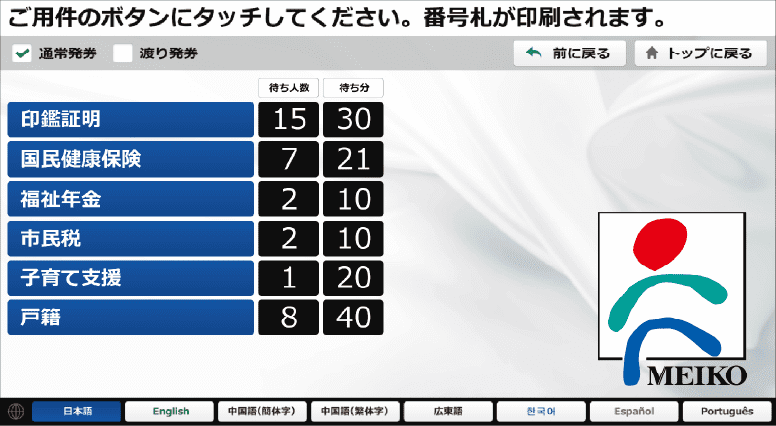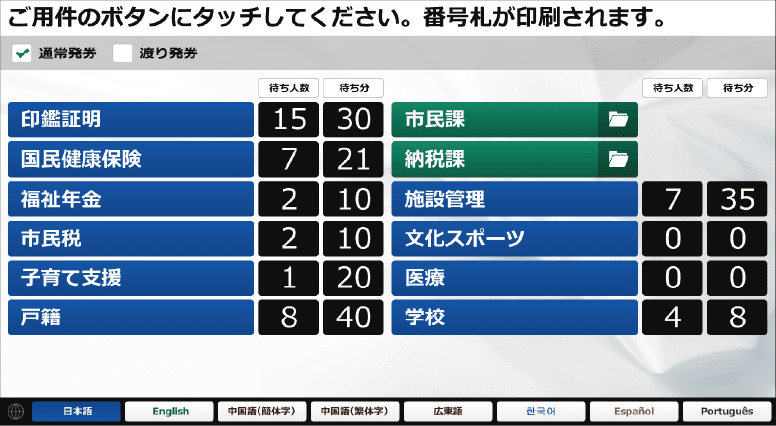 一度番号カードを発券されたら、各窓口からの呼び出しを待つだけ。トータルの待ち時間を短縮することができます。