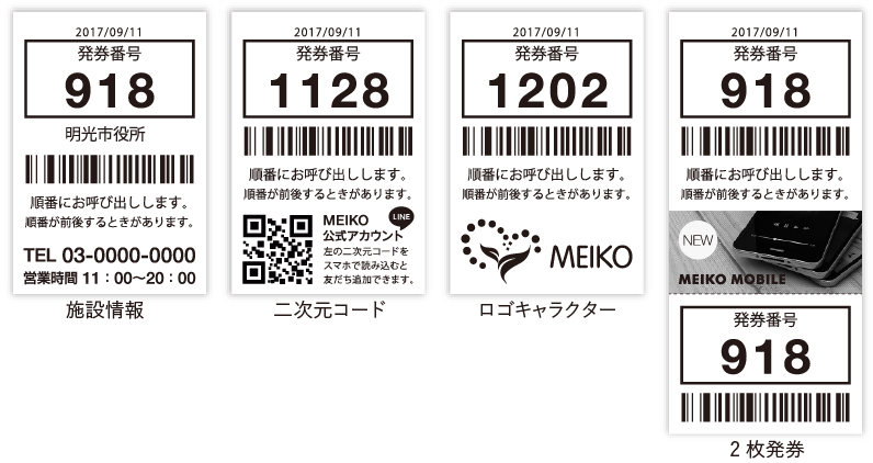 施設案内や営業時間、ホームページや電話番号などの二次元コード、広告などの写真画像の挿入も可能です(モノクロ印字のみ対応)。また、業務ごとに2枚発券の設定も可能です。